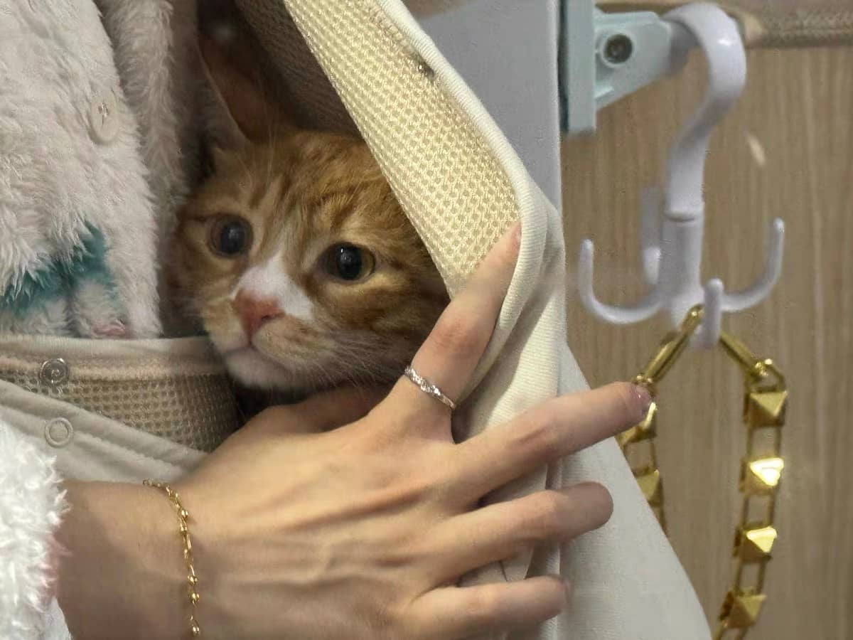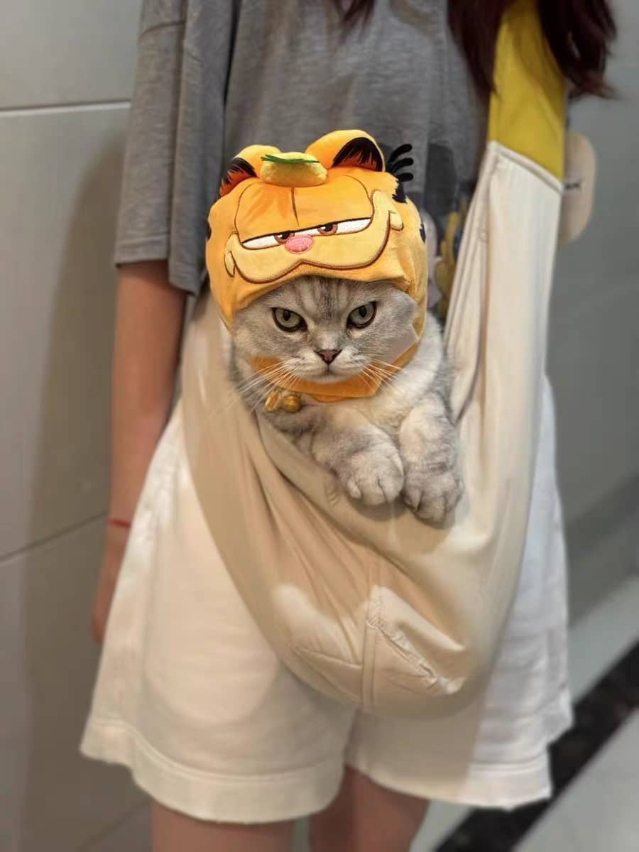 Gently place your cat inside — they sit naturally as they settle into the soft fabric.