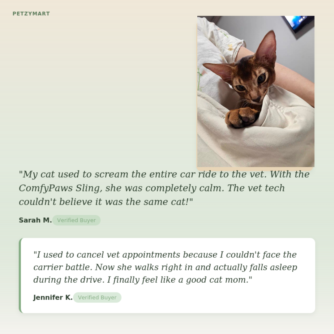 "My vet called her 'the most difficult cat' in 20 years. I had scratches up my arms constantly. She settled against my chest the whole drive. The vet did a double-take. Three months later — not a single scratch."