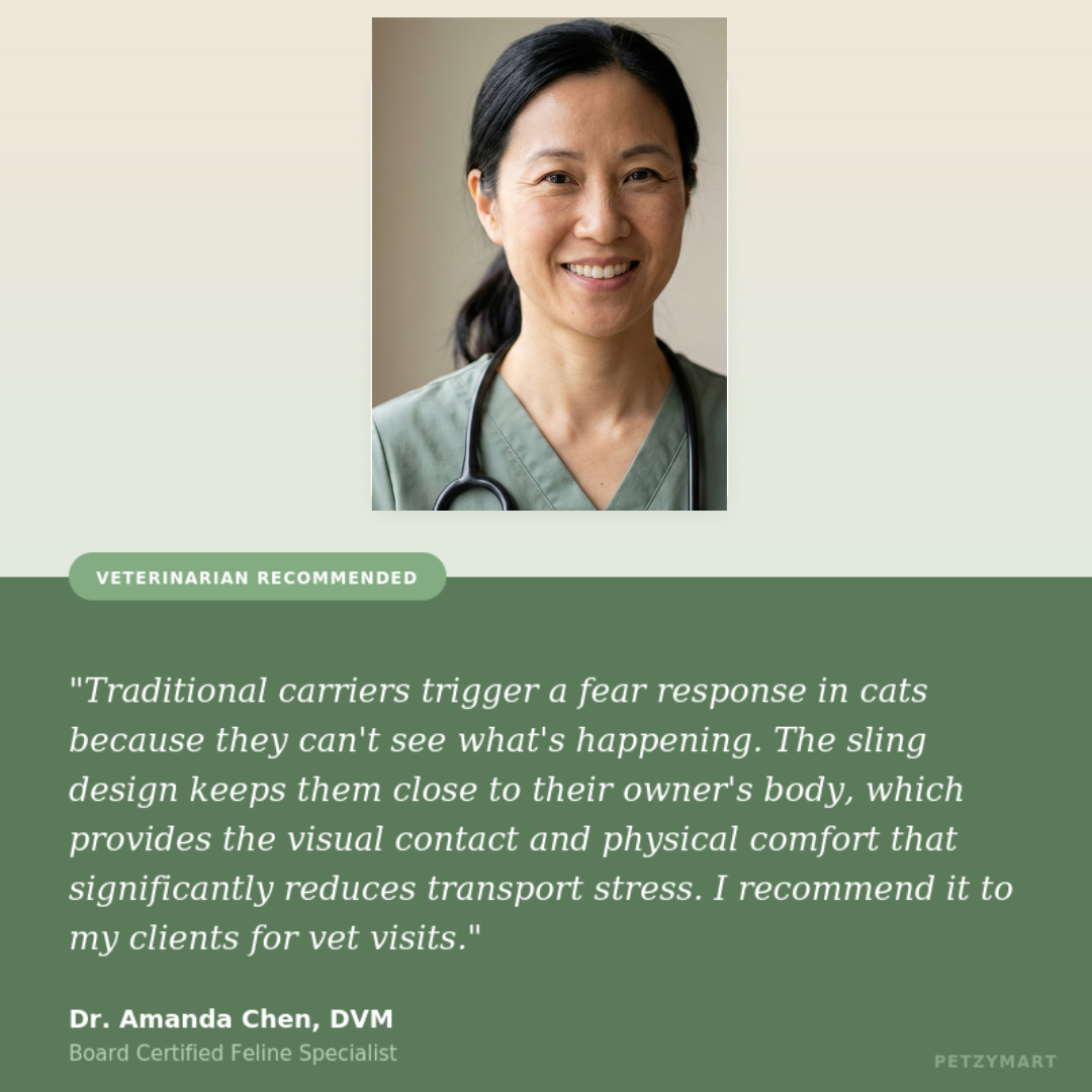 The Solution: ComfyPaw keeps her against your body the whole trip. The fear response doesn't activate because the isolation isn't there.